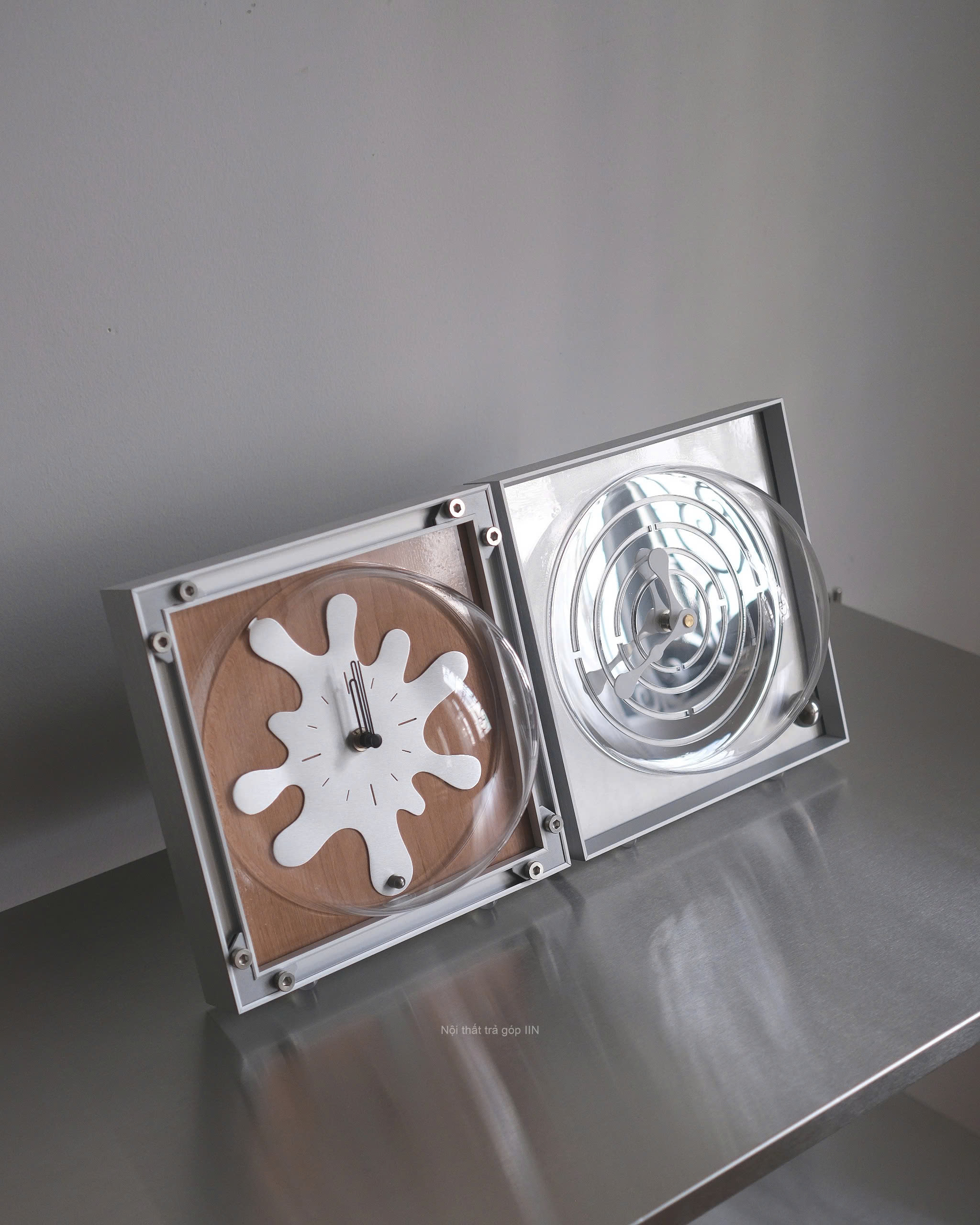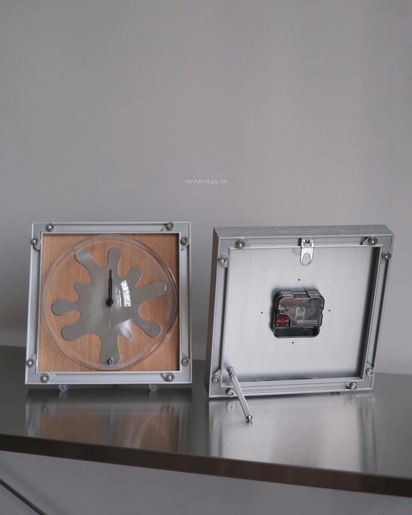 Đồng hồ để bàn kiêm treo tường với thiết kế độc đáo, mặt số hình vệt loang kết hợp nền gỗ tự nhiên và khung kim loại chắc chắn.