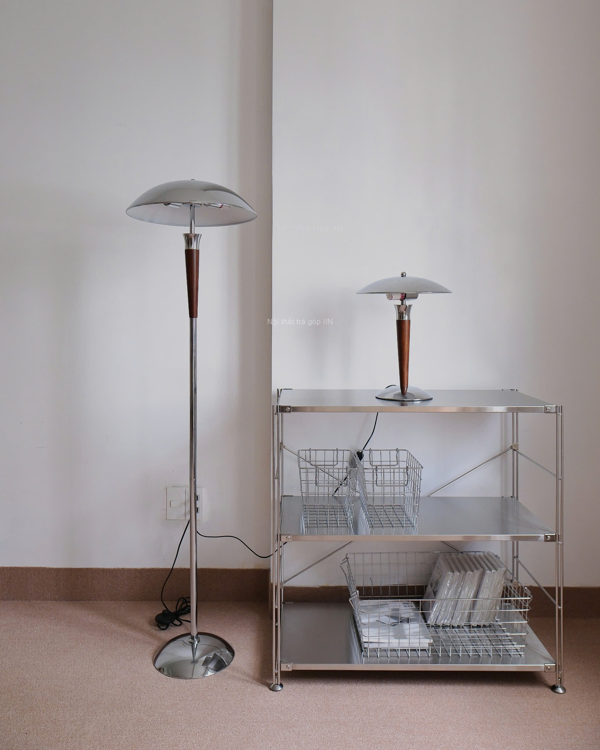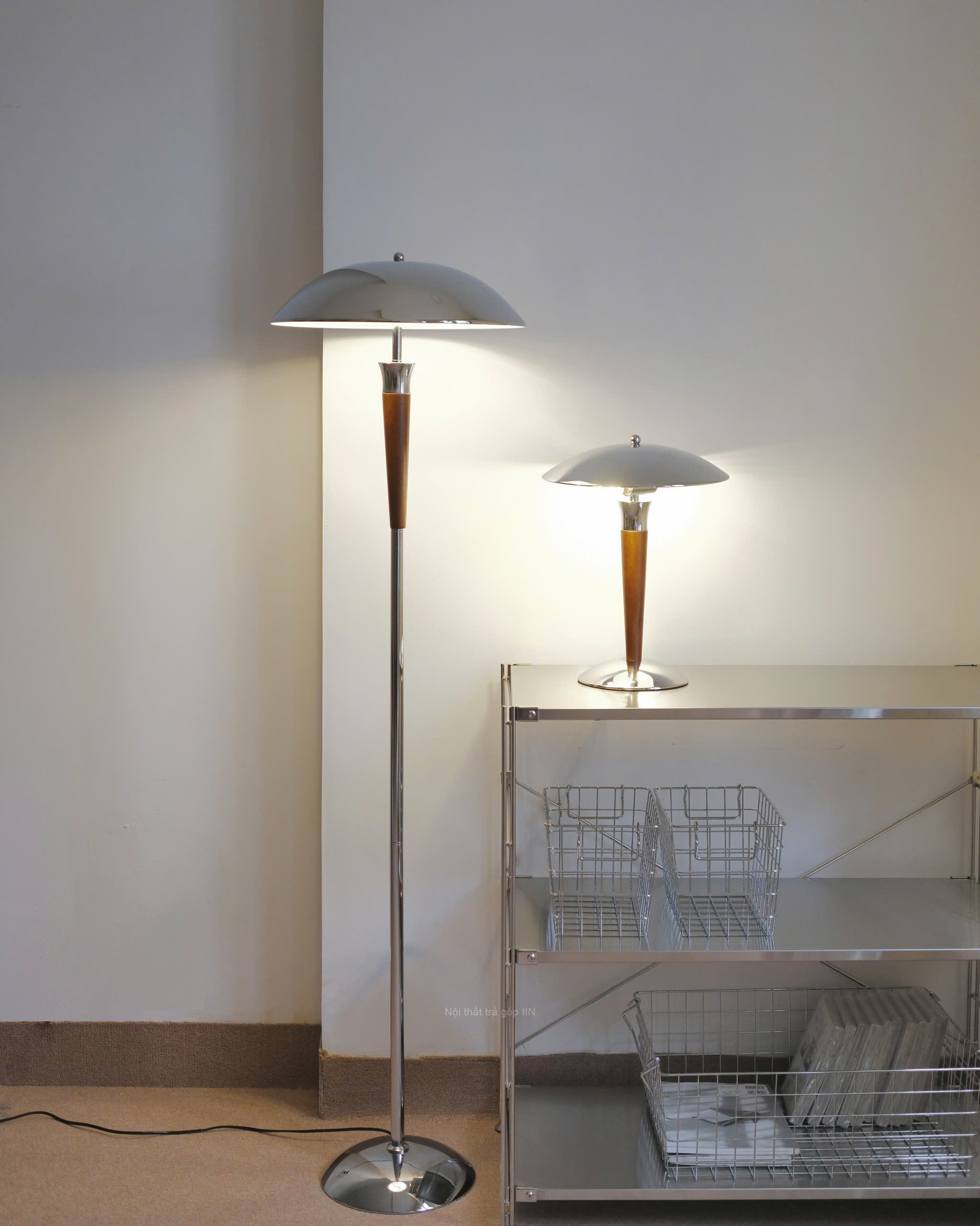 Một chiếc đèn nhỏ, một chiếc đèn cao, cùng phối giữa gỗ và kim loại. Phần gỗ mộc mạc, ấm và tự nhiên, giữ cho ánh sáng không bị quá sắc.