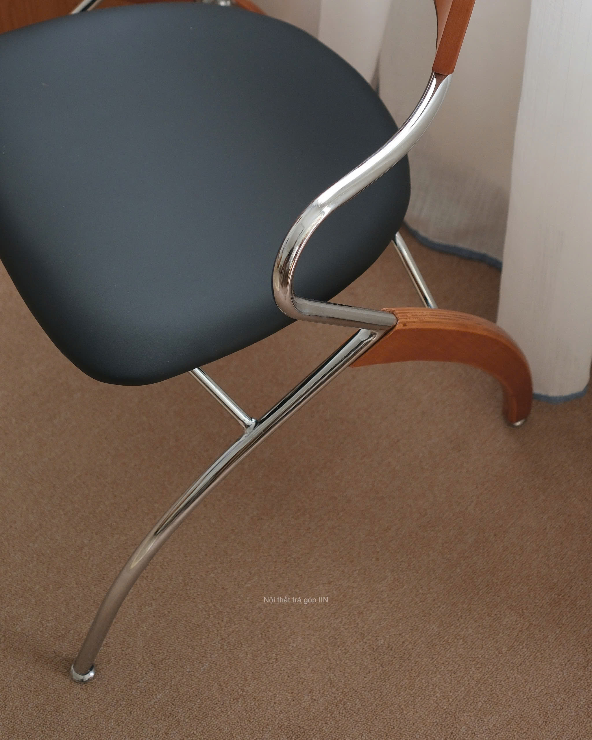 Chất liệu: gỗ, chân kim loại, đệm ngồi da