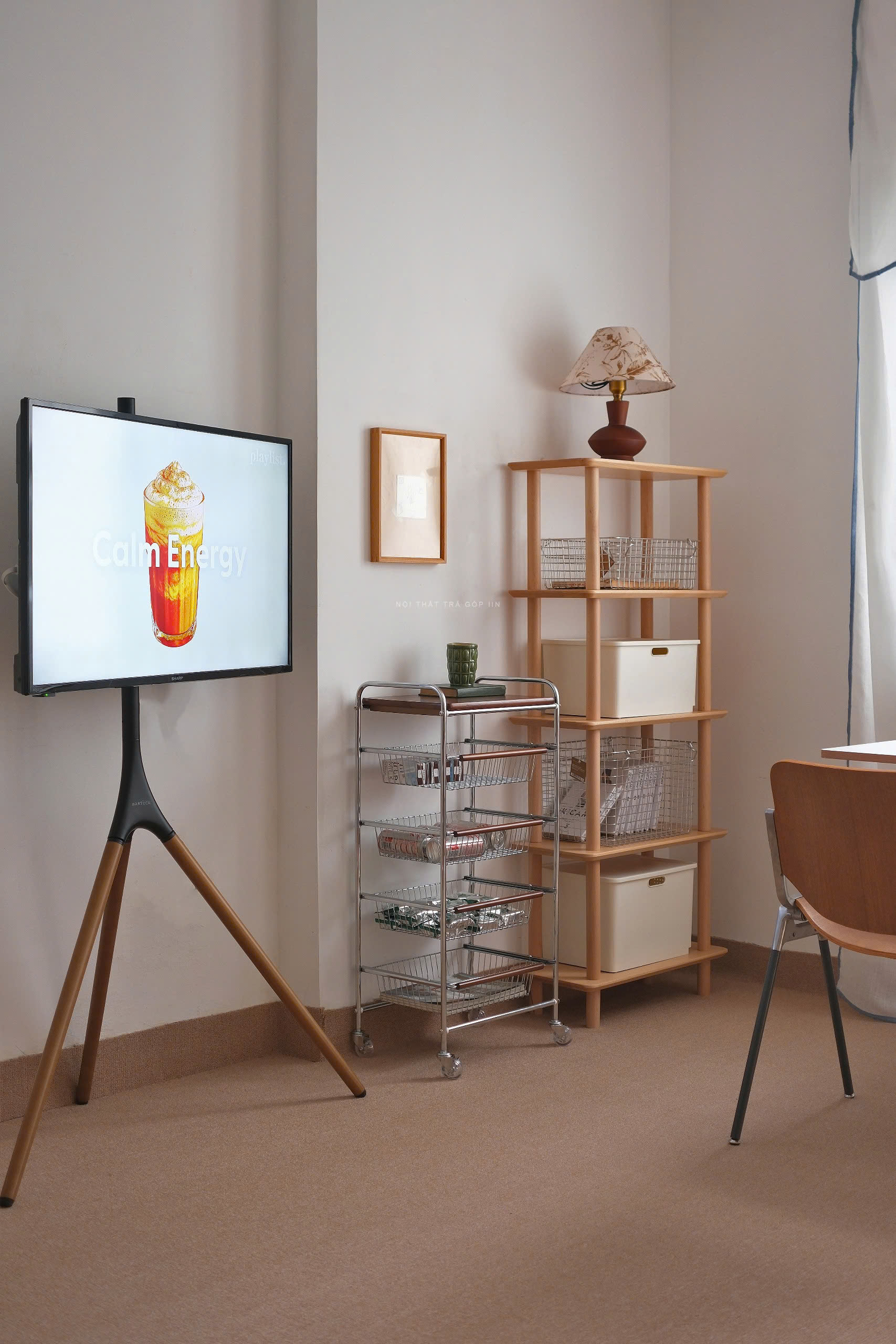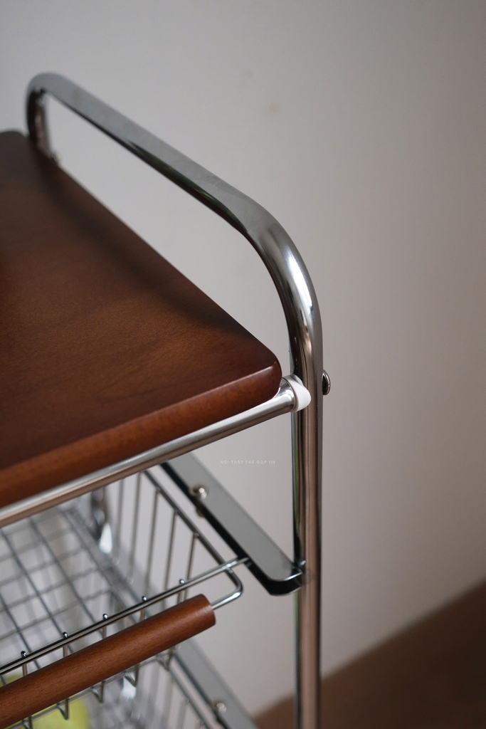 Chiếc kệ kết hợp gỗ sồi tự nhiên và sắt mạ crom chắc chắn, mang đến vẻ ngoài sang – hiện đại – dễ phối với mọi không gian. Thiết kế bánh xe xoay 360°, có khóa bánh an toàn, giúp bạn dễ dàng di chuyển hoặc cố định khi cần.