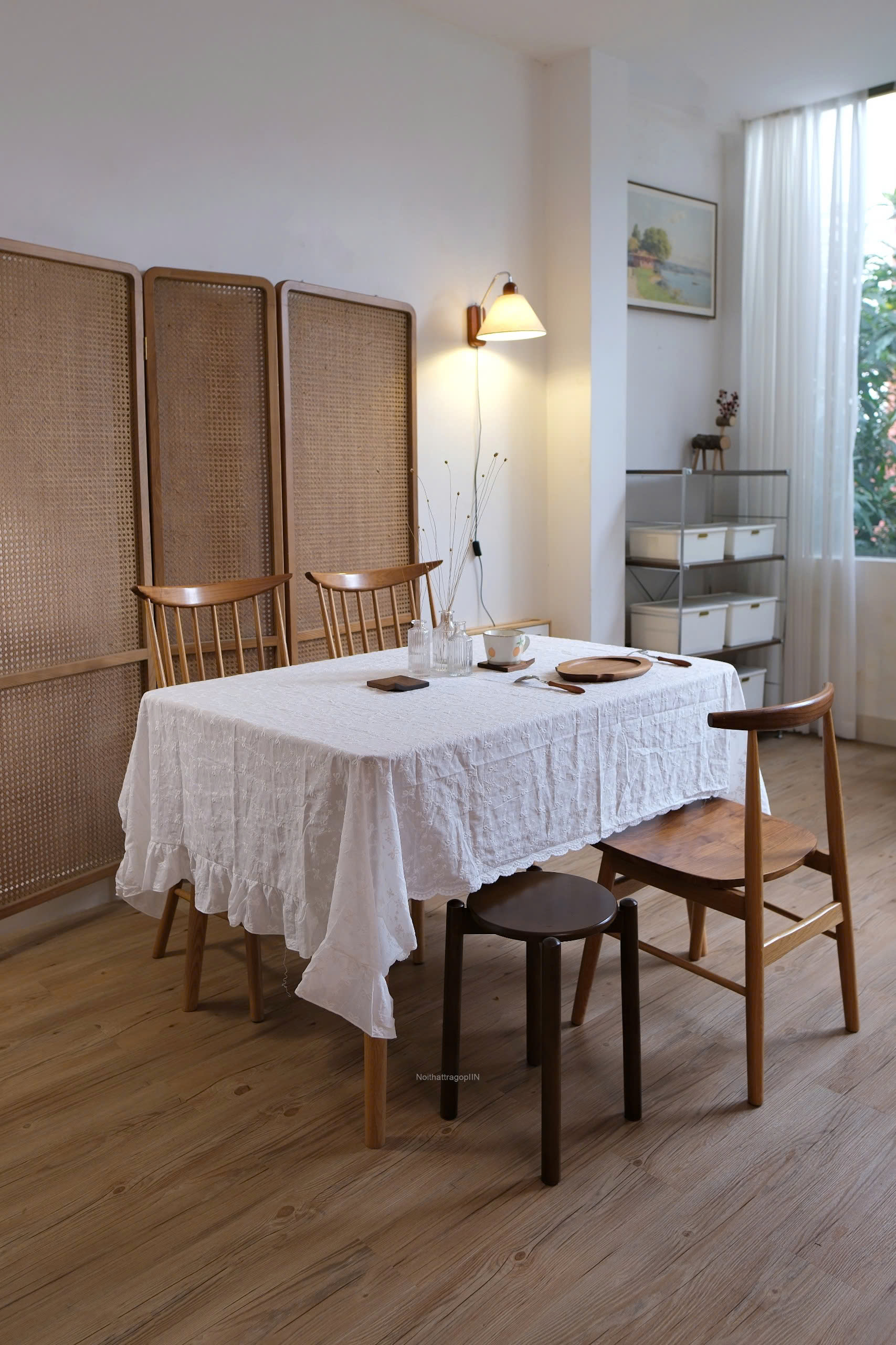 Khăn bàn với chất liệu vải boi thêu màu trắng mang cảm giác nhẹ nhàng và dịu dàng. Bạn có thể trải bàn ăn, bàn tiệc, bàn học, làm việc,...